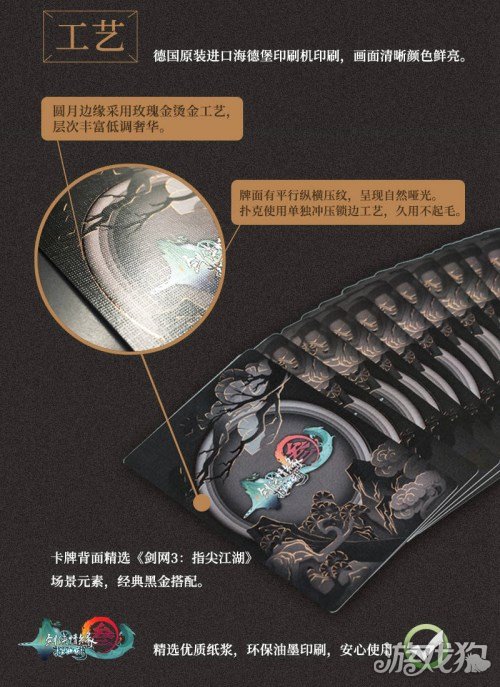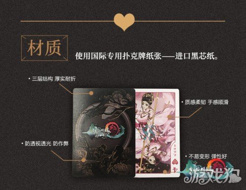 《剑网3:指尖江湖》典藏版扑克牌纸张材质选用了国际专用的扑克牌制作纸张,进口黑芯纸!黑芯纸共有三层结构,厚实耐折,不仅手感柔韧顺滑,兼具良好弹性的同时还不易变形,更能防透视防透光防作弊!