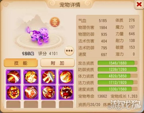 在技能搭配方面,首先要打上提高生存能力的高级神佑复生、高级强壮,其次是打上物攻宠的必备技能高级必杀、高级偷袭,最后是为其打上高级突进和高级强力,这两个技能可极大提升物攻宠的输出能力。