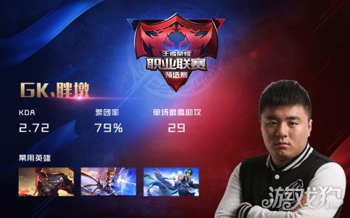 在2017年KPL王者荣耀职业联赛春季赛·预选赛第四周第二日的比赛中,产生了第四支晋级的队伍,GK以3:1击败SC取得2017年KPL春季赛的晋级资格。在这场比赛第一局中,GK胖墩的庄周为队伍保驾护航,取得了1杀12死29助攻的战绩,29次助攻也是KPL开赛以来的最高单场助攻记录!