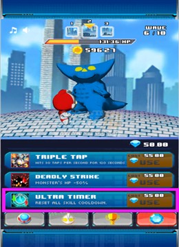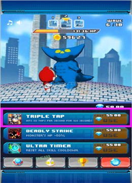 1、TRIPLE TAP,自动打击,我们使用该道具之后,会召唤出所有的奥特曼的兄弟对敌人进行自动无需我们手动点击的打击,一方面能够让玩家得到休息,另一方面出动所有奥特曼能够对敌人造成非常高的伤害,几乎可以秒杀很多怪兽。