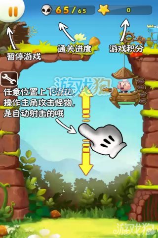 首先游戏的操作非常的简单,在屏幕上任意上下滑动来控制猪小弟的移动,猪小弟会自动射箭来击杀落下的松鼠,每关击杀松鼠的数量达到指定的要求就能过关。游戏的星星积分数量则是决定了大家通关的品质。是不是三星就看积分的多少咯。