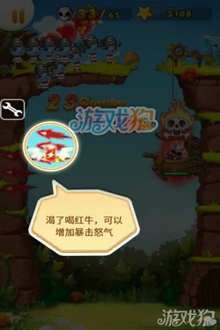 游戏中随机出现的道具还有一种就是下图所示的红牛饮料,喝了这种饮料可以增加怒气,积攒到一定程度的时候就能发出大招,红色火箭三连发,松鼠全部啪啪啪。