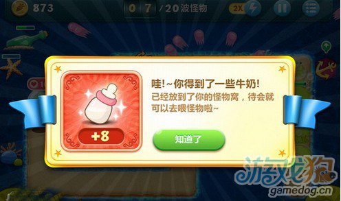 这一关礼盒出现的几率还是比较大的。有时运气好,在怪物第1波,建一个船锚炸弹连续打几个怪物,就可以获得饼干礼盒;在建立几个章鱼炮塔后迎战第2波怪物时就可以获得牛奶礼盒。在获得礼盒后,玩家可以重新开始这关游戏,可以增加出现礼盒的机会,获得更多的牛奶和饼干。