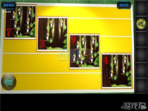 3.然后玩家们可以看左边墙上的壁画,每一幅壁画上面的鸟的树木都是不一样的,分别是7,3,9,4。