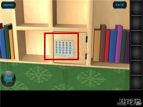 5.然后玩家们点击右边的书架,可以看到在书架下面的格子中有一道需要解开的密码锁。
