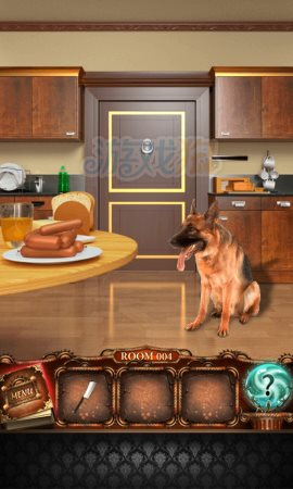 右边的橱柜下面有刀,拿下来之后切一根香肠,把香肠丢给狗,于是我们就能走出去了。