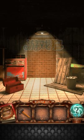 先从左边的墙上拿下一个挂钩,用挂钩把地上的箱子打开,得到一个炸药。把炸药安装到门上,再用火柴点燃,顺利过关。