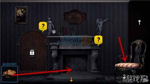 3.然后玩家们将在门口收集起来的木柴放到壁炉下面去,并且将右边的椅子移开,这样的话玩家们就会发现一个下去的入口。