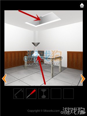 4.将桌子移动到正对着上面的洞口处,将拿到的沙漏型凳子放到桌子上,这样才能成功地爬到上面去。