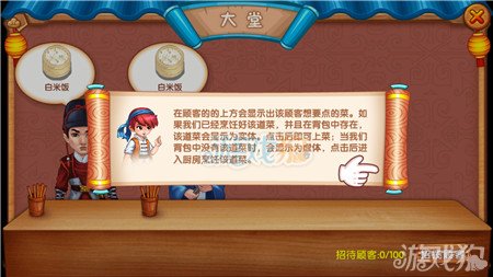 游戏最主要的玩法就是看大堂中的客人想要吃什么我们就要去做什么。在顾客的上方会显示出该顾客想要吃的菜。如果我们已经烹饪好这道菜就能直接上菜给顾客吃,当我们没有这道菜,就要去收集食材来制作这道菜,收集食材其实也就是玩一个小游戏。
