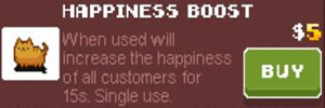 2.猫咪,这个道具玩家们在购买之后放在厕所里面,这样的话可以增加顾客能的开心程度,这样的话客人们就会以较慢程度从开心变成不高兴了,这样玩家们就有更多的时间来安排顾客了。