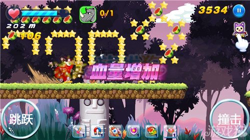 3.玩家们在前进的时候除了那些小的西瓜和星星之外偶尔还会遇到一些大的西瓜,玩家们收集这些大的西瓜可以回复大量的气血,玩家们要注意收集这些道具来帮助自己回复生命值,这样才能前进的更远。