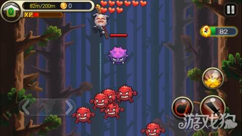 游戏的玩法是比较简单的,一开始的时候我们需要像发射三维弹球一样把角色给发射出去,力度越大自然初始起飞的高度就越高。接下来会出现怪物,我们需要按攻击键去攻击怪物,并且使自己再次反弹起来,如果没瞄准直接掉落下去,就会损失爱心。爱心消耗完或者是没有完成任务,关卡都是不能通关的。
