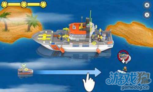 为了最大限度地提高游戏进程,游戏并没有加入任何剧情,与《乐高:城市消防员》相比,除了职业发生变化之外,游戏的视角以及玩法也都截然不同,全程采用俯瞰的视角来进行游戏。而蔚蓝的海水,摇曳的椰树,悠然的白云构成了一幅清爽画卷,正值炎炎夏季发布这么一款作品确实也非常应景。游戏没有复杂的玩法与操作,在 48 道关卡中,玩家需要将所有海上被困人员一一救起。身为专业的救援团队,当然会配备有足够的救生装备,而且可以使用摩托艇、橡皮艇和直升机三种救援工具。在游戏中,被困人员会被放置在某个特定地点,通过划动操作画出一条救援路线,紧接着救援小哥会依照线路指示疾驰而去将人救起并过关。