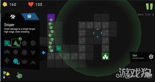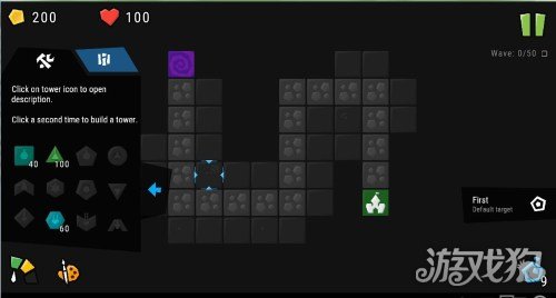游戏开始,注意左上角的金币数量,前期有两种武器,一个售价40,一个100,我们本方塔的生命值为100.敌方进入一个将会减去一个生命值。