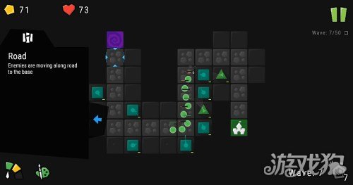 一群进攻的圆形小球开始出现,左边紫色为进攻敌军方向,右边绿色为我方塔,点击全灰色的方块,在左边购买一些机枪弹药。按住购买的物品,向灰色方块上托过来,当小球经过时,就会主动进行攻击。