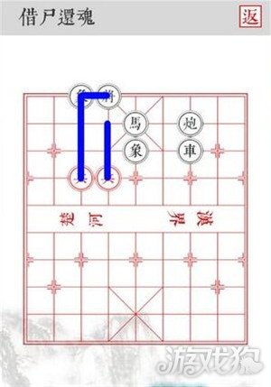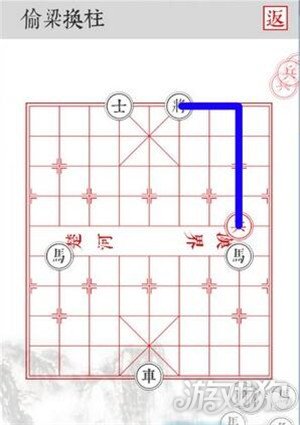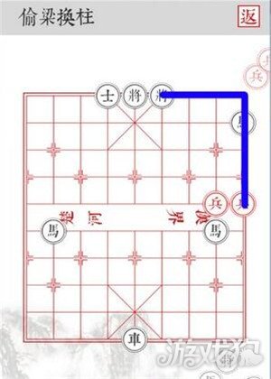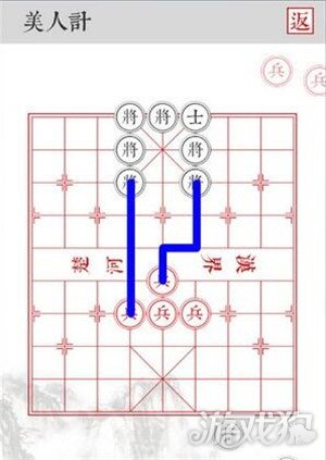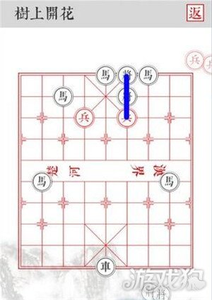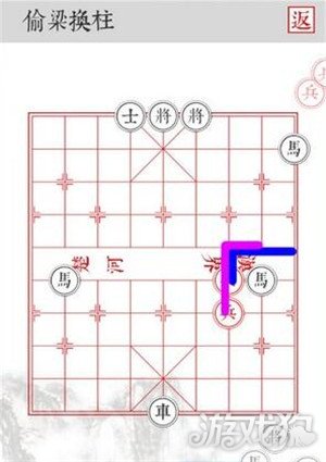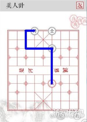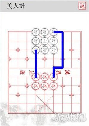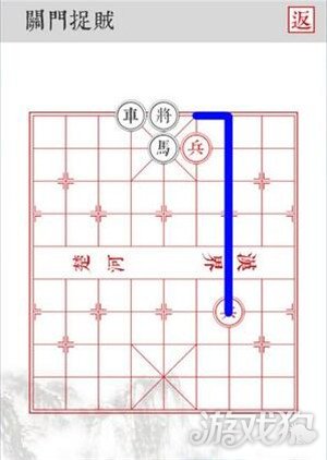 2.沿着蓝色路线移动,三路兵从侧面吃掉黑将即可顺利过关。