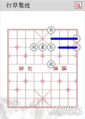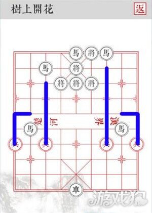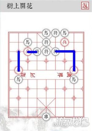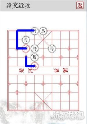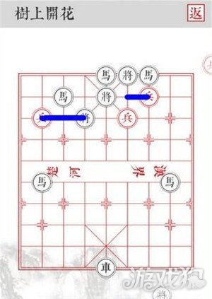 4.沿着蓝色线路移动,四路兵前进两格,将黑将全部击杀即可顺利过关!PS:根据规则,黑棋会优先吃左侧的棋子,左侧兵是给马吃的诱饵,延缓一回合保证四路兵安全击杀。