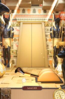 第三关点击地上的蛇头拐杖,放入前面的机关中,向左拉动。