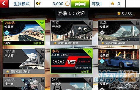 游戏的生涯模式比较庞大,分为若干赛季,赛季1有系统指定的赛车生涯模式,也就是专属Audi R8 e-tron的个人秀,在这模式中玩家要控制R8进行各种模式的比赛,并最终赢得胜利,生涯模式的另一种则是由玩家选择的挑战赛,而这几种挑战赛主要包含了经典赛。淘汰赛,传染赛,撞击赛等等,并且部分地图的部分挑战模式需要星星解锁才可进行,游戏中的赛季1又称欢迎赛,赛季2则为超越竞赛,赛季3为街头规则,赛季4为精英,赛季5喷射,赛季6火线追击,赛季7极速热力,赛季8则为极速凌云,想进入到下一个赛季,就必须完成当前所在的赛季,并且解锁每一个赛季要求的星星数量则会越来越多,生涯模式就是一个漫长的模式,见证你从初级赛车手到精英赛车手的过程。