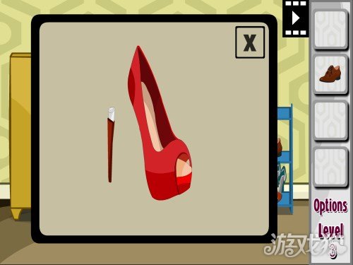 点击查看右边摆放的鞋架,拿走一只红色高跟鞋和皮鞋。