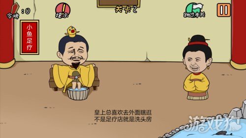 点击从右下角的水塘里拖出小鱼加到皇帝的足疗桶里。