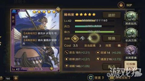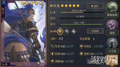 张辽的面板属性极其优秀,攻防成长属性使得张辽可以轻松胜任所有位置,高达2.72的速度成长远高于其他武将,