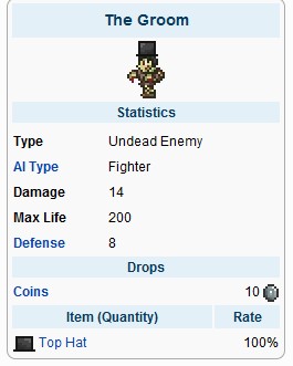 马夫僵尸 地点:血月的地表 攻击14 防御8 血200 掉落10银币 高顶帽