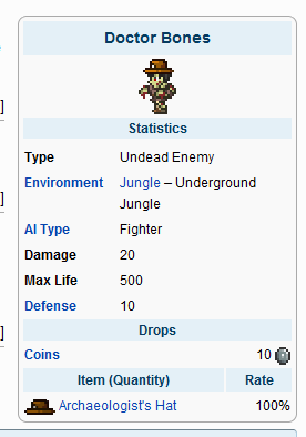 博士僵尸 地点:丛林 地下丛林 攻击20 防御10 血500 掉落10银币 考古学家的帽子