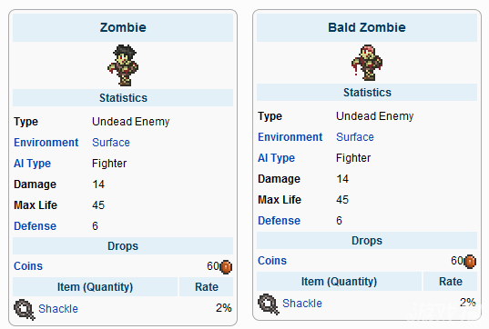 普通僵尸 地点:地表 攻击14 防御6 血45 掉落60铜板 2%概率掉落镣铐(饰品 +1防御)