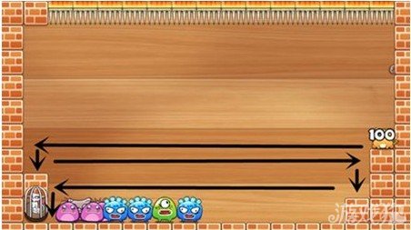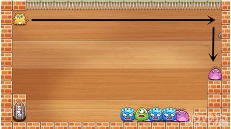 接下来向上滑行碰到砖块阻挡后向左滑行,再向下滑行就可以消除第二个怪物。