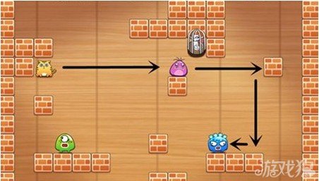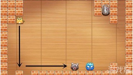 首先让小猫向右滑行,接着向下滑行消除第一个怪物。