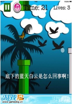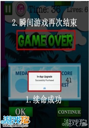 4.千万不要内购续命啊!它是个坑爹货啊!3条命用完了就会问你:“亲,要不要继续来一发呀?”。木木可耻地选择了“我要,我要,我还要”续了3条命之后。结果游戏会弹窗提示你购买成功!这时我们是无法操作游戏的。问题是游戏里面小鸟怎么还在飞啊?瞬间3条命就又用完了啊!可怜的小鸟又摔死了啊!