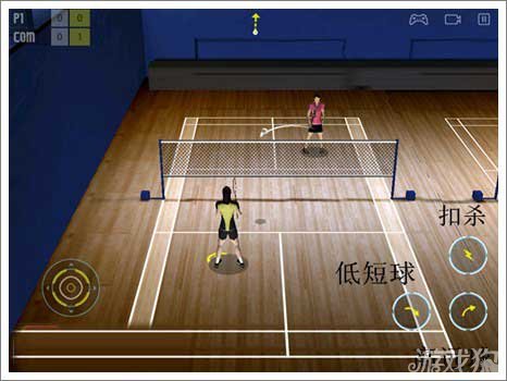 2.游戏右下角有三个击球按钮。它们分别为:高远球、低短球和扣杀。高远球弧线高,大多落在后场,低短球落点近,弧度低,大多落在前场。而扣杀就是跳起大力扣球啦。