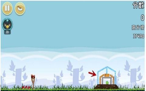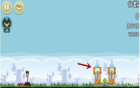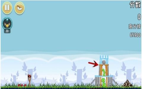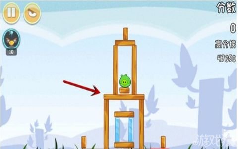 小编讲解:这个关卡必须要打到图片中所指的那根木头,一只小鸟飞过去,然后全部倒掉也就轻松过关啦!