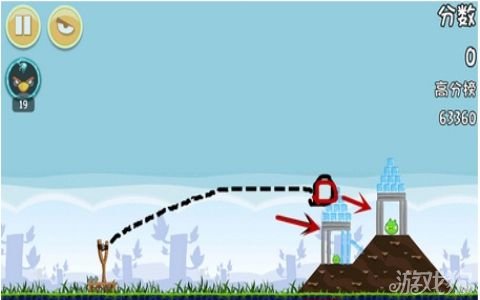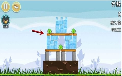 技巧:这个关卡要直接忽略掉外面的冰层,直接瞄准里面两根柱子的中间,这样就能直接倒下了!