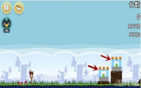 技巧:这个关卡跟第一关有很类似的地方,但是也要让大石头来帮你的忙,瞄准箭头所指地方,让大石头掉下去,把所有小猪都砸扁!