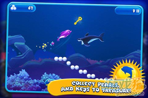 游戏的操作很简单,点击屏幕不放手,海豚就会潜入海底,放手海豚就会不断往上游,冲上云层。要注意的是海中的鲨鱼,一但碰到,就会被吃掉了。