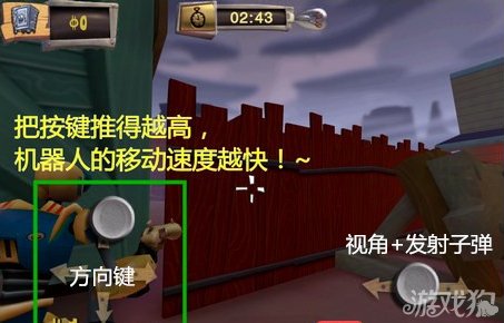 2.玩家按住移动位置的方向键推得越高,机器人的移动速度会变快哦!发射子弹只能一下一下的连续点击,不能一直按住发射子弹。