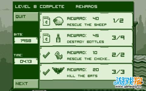 通关画面,会显示所接任务的完成情况和最终用时。最后说几个注意事项:1. 就算是同一关,当你挂了之后再走一遍时,箱子里的东西或者怪的位置是会改变的。2. 向下射击的方法是连按两下跳跃键再按射击键就可以向下开枪了。3. 开枪时牛仔会往后退,注意身后的怪,悬崖或者缝隙。