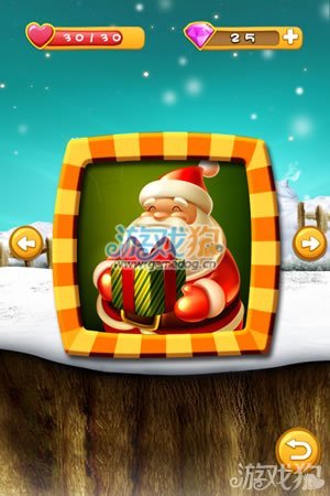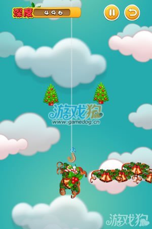 圣诞老人驾着麋鹿在天上停了下来,然后掏出钓鱼竿来钓礼物,下方的礼物非常的多,钩子下降的过程中,不管是碰到了礼物还是炸弹,都会停止下降,然后再向上返回,返回的途中可以勾住其他的礼物一起带走,同样也是需要小心炸弹的,被炸弹炸一下,就会损失一部分礼物,当钩子被圣诞老人收回,他就会清点战利品,最高可获得三星评价,如果连1颗星星都没有获得,那么会损失一条生命。