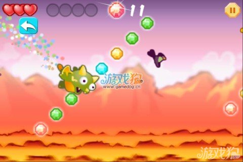 游戏的玩法实在是没有新意,用手指按住屏幕就可以让小飞龙一直往前上方飞去了,松开的话就会下落。路途上危险重重,不仅地面上很致命,就连空中的小鸟啊什么的都足以对你造成致命的危险,没办法,不过也还是有些好处的在空中有很多的宝石,我们可以控制它去拿到这些宝石哦。