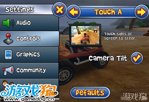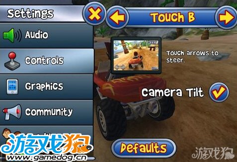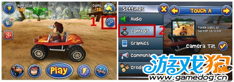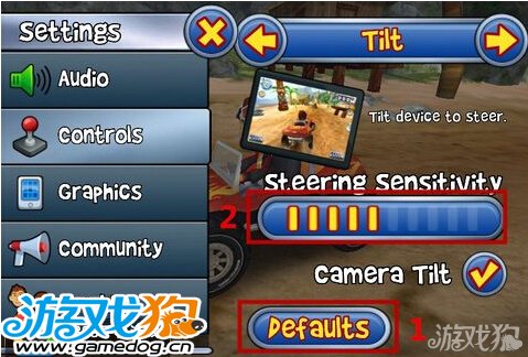 上图中的Tilt模式为重力感应模式,点击Defauts按键(图示1处)就可以切换为重力感应模式了。而2的位置则是给我们来调节灵敏度的。