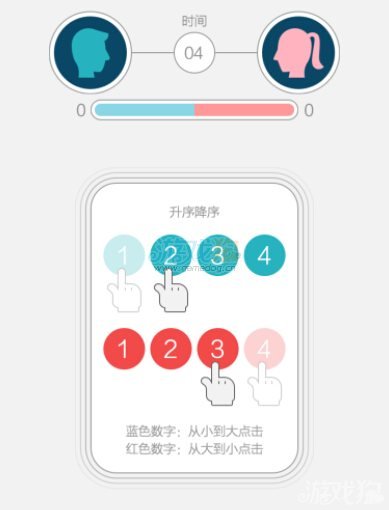 上图的升序降序的题目,也是考验着玩家们的思维和反应能力,其中的蓝色的部分,我们需要按照升序的方式来依次点击出现的数字,而红色的则要求我们依照降序的顺序来点击出现的数字,出现的频率随机,所以玩家们要仔细的看清楚。