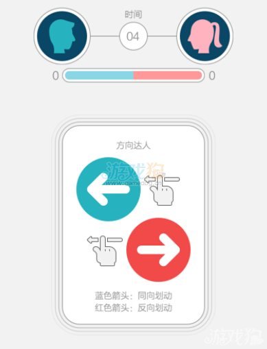 上图的是方向大人,我们需要根据途中的方向来进行判断,其中的蓝色表示,我们需要按照图片中的箭头来进行滑动,如果是红色的话,我们就需要向相反的方向来进行滑动,主要考验玩家们的反应能力。