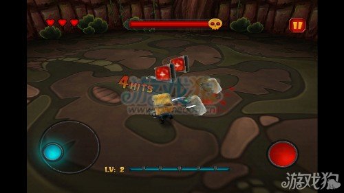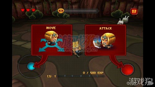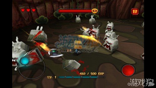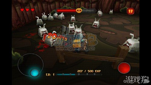 游戏的玩法我们可以先看下图,可以看到左边的摇杆控制的是小人的移动方向,左边的红色的点就是攻击的按钮。玩家需要灵活的控制好这两个点才能在游戏里面满血过关。