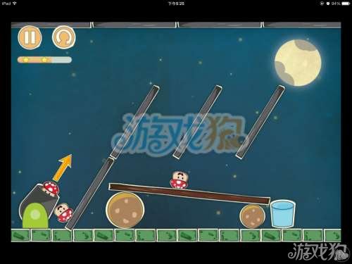 在一些关卡中,木桶的位置非常的刁钻,直接射击的话很难将蘑菇给射进去,这时候我们就可以利用地形来达到目的了,如下图中利用斜坡来让蘑菇滚动到木桶中。