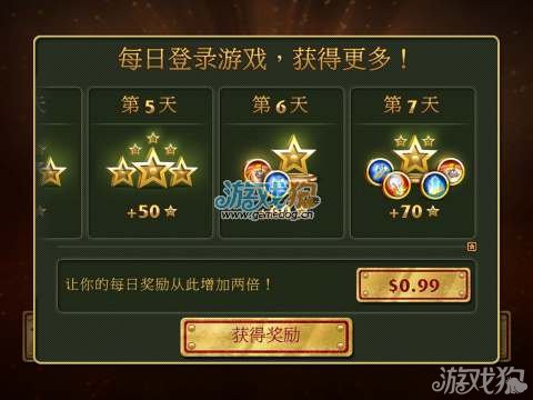 在游戏中,玩家们的登陆是可以获得一定的奖励的,一周为一个轮回,每一天都会有着星星作为奖励,而在第六天和第七天的时候,还会赠送一些特殊的工具供大家使用。
