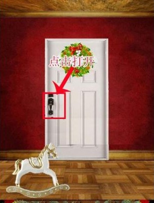 进入100份圣诞礼物第1关之后,我们会看见前面有一个玩具木马,还有一扇白色房门,点击房门的把手(如上图红框所示)。