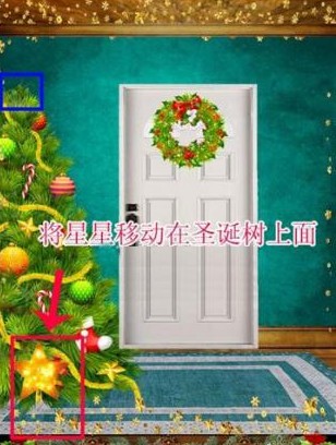 打开礼物之后,我们看见里面是是一颗星星(如上图红框所示),圣诞树上面好像少了一颗星星,点击移动星星在圣诞树上面(如上图篮筐所示)。